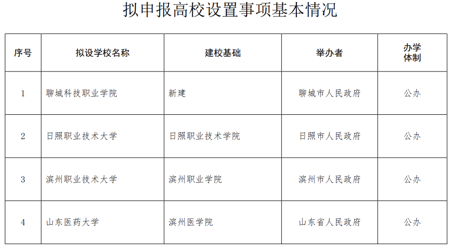日前,山东省教育厅公布《关于拟申报高校设置事项的公示》。其中,拟新建聊城科技职业学院,日照职业技术学院、滨州职业技术学院拟申报为职业技术大学,滨州医学院拟申报为山东医药大学。