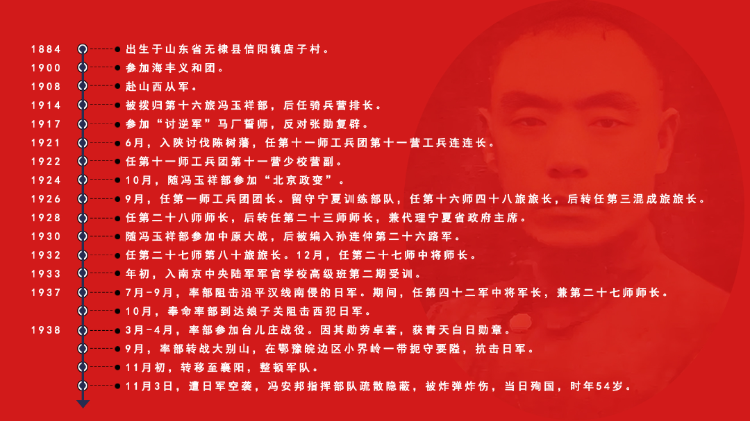 “古棣信阳,汉垒齐疆,物阜天华,育化忠良……”在烽火连天的抗战史册上,一位来自山东无棣信阳镇店子村的名字熠熠生辉——冯安邦将军。这位从鲁北乡村走出的铁血军人,最终将一腔热血洒在襄阳大地,用生命诠释了信阳儿女的家国担当。